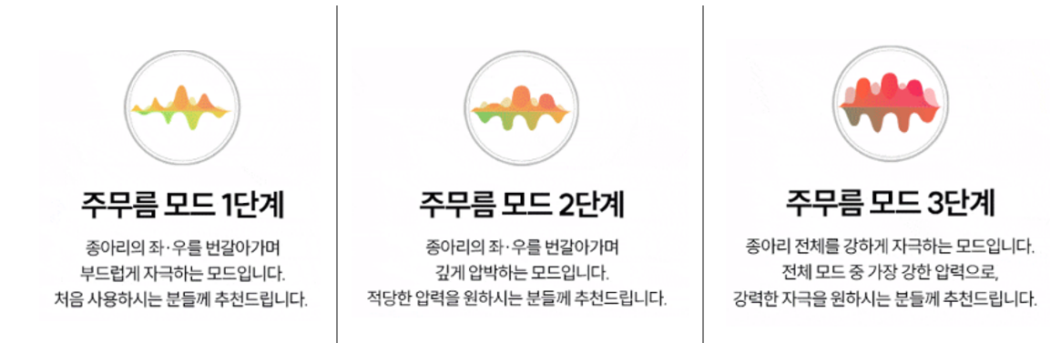 마사지 기능 관련해서는 풀리오는 3가지 주무름 모드가 있습니다.